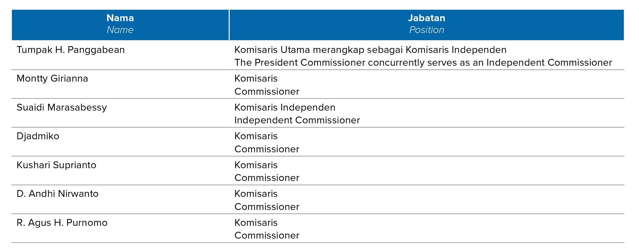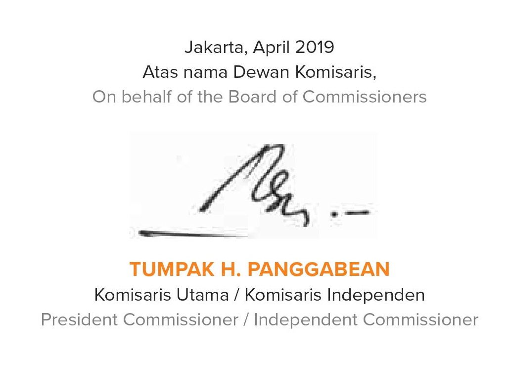 Demikian Laporan kami sampaikan. Atas kepercayaan Pemegang Saham dan dukungan Direksi serta pemangku kepentingan lainnya, Dewan Komisaris dapat menjalankan tugas dan tanggung jawabnya dengan baik. Pada khususnya kepada Direksi dan seluruh pegawai, Dewan Komisaris memberikan apresiasi setinggi-tingginya. Berkat dedikasi dan profesionalitas kerja yang diberikan, Perseroan dapat menghasilkan kinerja yang cukup membanggakan. Dewan Komisaris berharap agar kerja sama yang efektif dapat senantiasa dipertahankan, guna memberikan manfaat bagi bangsa dan negara.
